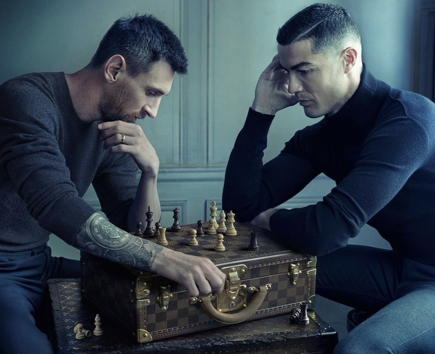 Die Marke Louis Vuitton entschied sich nicht nur wegen des Endergebnisses dafür, sondern auch, weil zwei der besten Spieler ihrer Generation gegeneinander antraten: Carlsen (gespielt von Ronaldo) spielte mit den weissen Figuren, Nakamura (gespielt von Messi) mit den schwarzen.