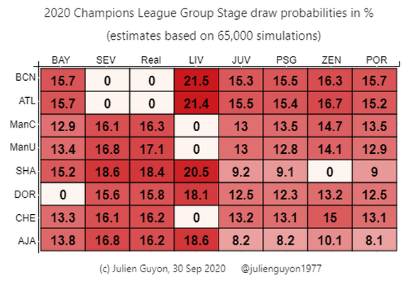 • Die Gruppen werden in zwei Hälften geteilt: A bis D und E bis H. Spielt die eine Hälfte dienstags, muss die andere Hälfte mittwochs ran und umgekehrt. Um bei Fernsehübertragungen zu verhindern, dass beispielsweise alle vier deutschen Teams am selben Tag spielen, werden «TV-Paare» gebildet. Aus der Bundesliga bilden beispielsweise Bayern München und Borussia Dortmund ein «TV-Paar», gleiches gilt für Leipzig und Gladbach. Als Beispiel: Wird Bayern in die erste Hälfte des Tableaus gelost, spielt Dortmund automatisch in einer der Gruppen E bis H.