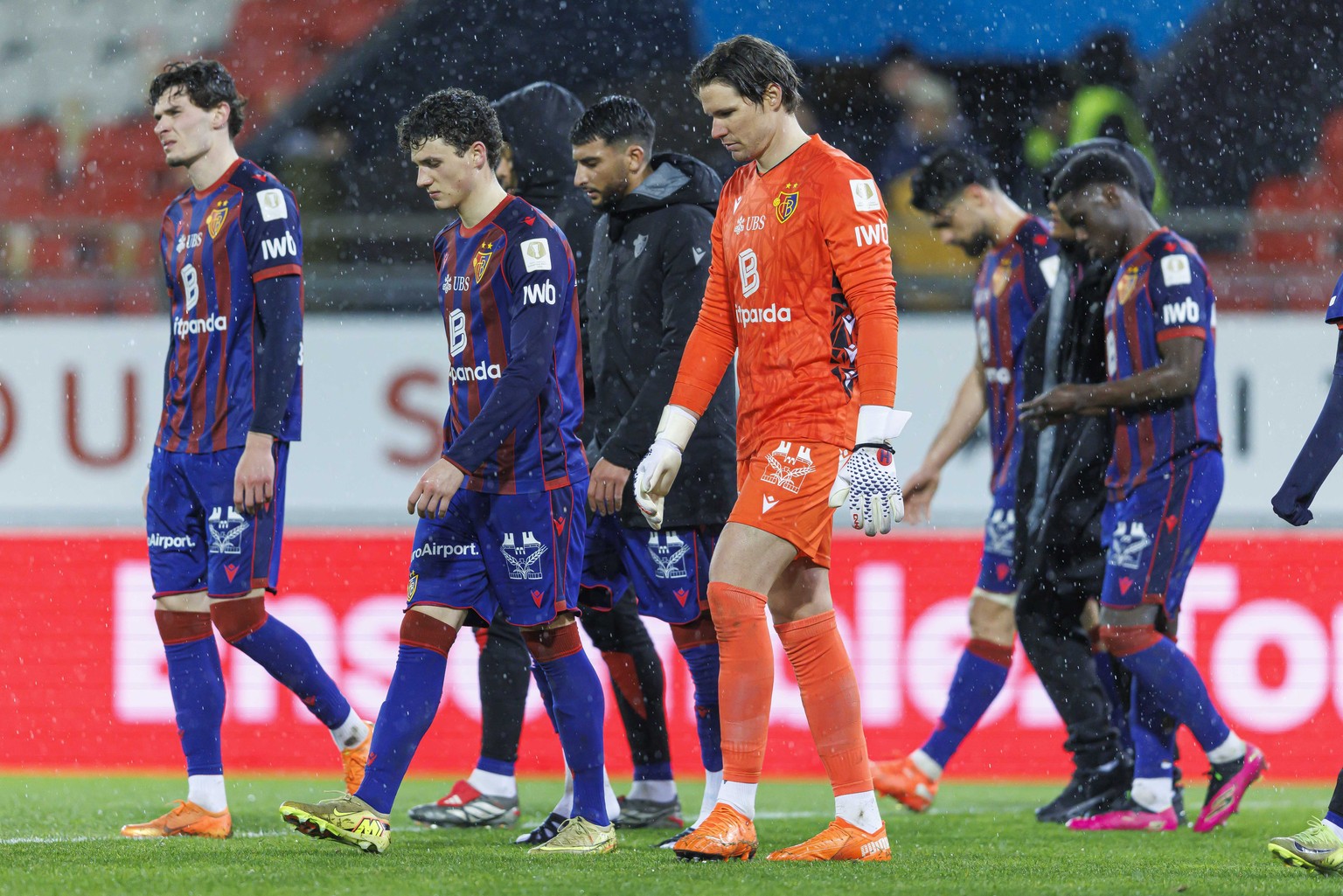 Le gardien Marwin Hitz (FCB) quitte le terrain avec ses coequipiers apres la rencontre de football de Swiss Super League entre le FC Sion, FCS, et FC Basel, FCB, ce jeudi 12 fevrier 2026 au stade de T ...