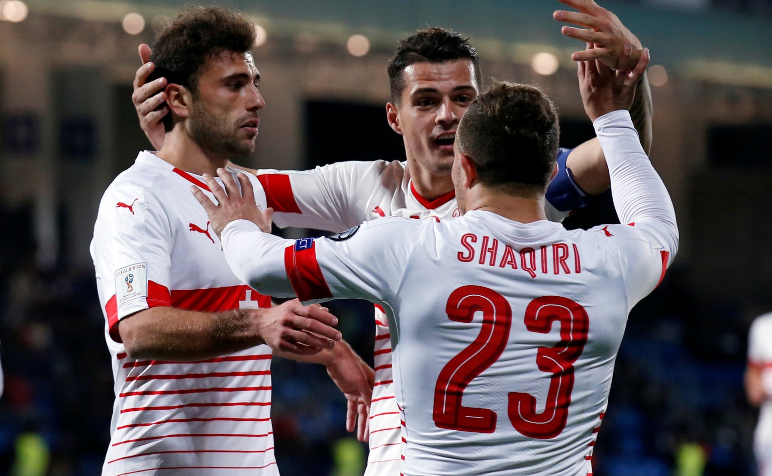 Football Soccer - Andorra v Switzerland - World Cup 2018 Qualifier - Estadi Nacional, Andorra la Vella, Andorra - 10/10/16.Switzerland's Xherdan Shaqiri, Admir Mehmedi and Granit Xhaka celebrate  ...