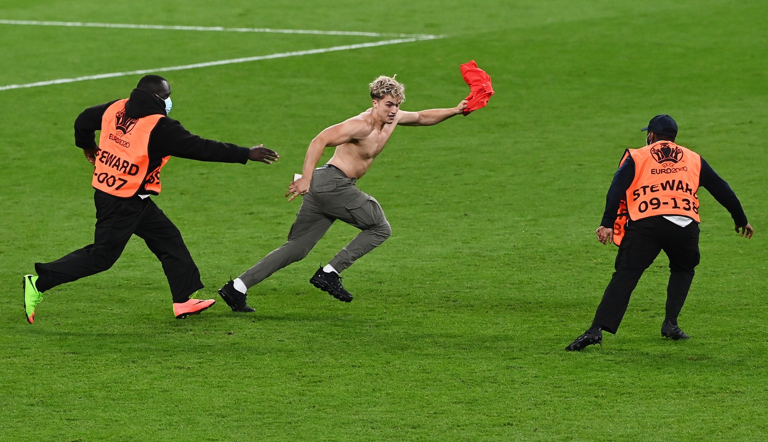 Aufregung im EM-Final zwischen England und Italien kurz vor dem Ablauf der regulären Spielzeit: In der 87. Minute rennt ein Flitzer aufs Spielfeld und es kommt zu einem längeren Unterbruch. Denn der blonde Mann mit nacktem, muskelbepacktem Oberkörper ist viel flinker als die Sicherheitskräfte und lässt sich von diesen einfach nicht einfangen. Immer wieder kann er sich von seinen Verfolgern losreissen, erst nach fast einer Minute wird der Flitzer gestellt und aus dem Stadion geführt.