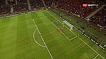 2. Minute: Ein erster Aufreger nach nur zwei Minuten, doch Carlos Bacca säbelt den Ball im Stile eines 5. Liga-Raubeins in den Warschauer Nachthimmel.