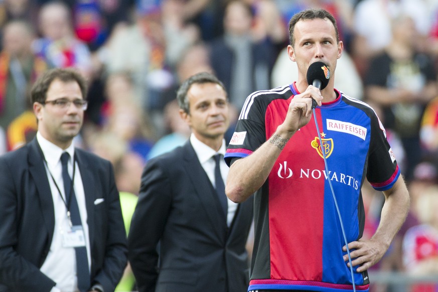 Marco Streller bedankt sich bei den Fans im st. Jakob-Park für eine emotionale Abschiedsparty.Bild: KEYSTONE