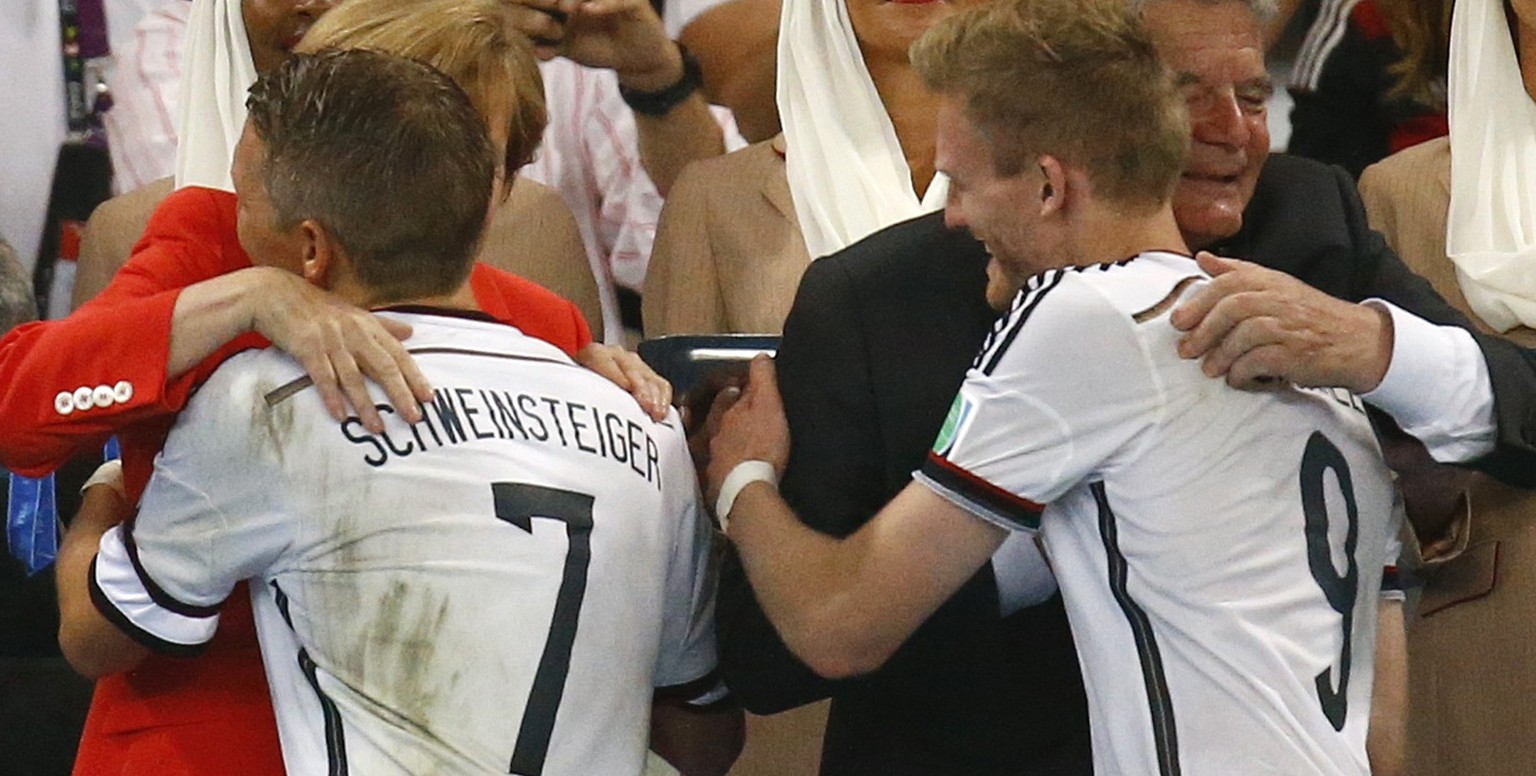 Knuddeln verbindet: Schweini und Schürrle schmusen mit den Höchsten Deutschlands.Bild: KAI PFAFFENBACH/REUTERS
