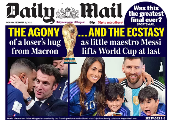 «Argentinien im Traumland! Lionel Messi versetzt das Lusail Stadion in Verzückung, als er endlich seinen Traum realisiert, die WM zu gewinnen, und führt Argentinien in einem nervenaufreibendem Penaltyschiessen gegen Frankreich in einem der besten Finals der Geschichte zu Ruhm.»