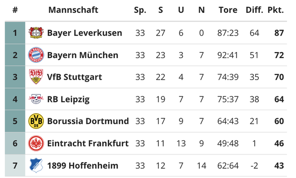 Die Bundesliga hat in der 33 Spiele alten Saison bereits zwei grosse Überraschungen offenbart. Rekordmeister Bayern München verpasst nicht nur den Gewinn der Meisterschaft, sondern steht in dieser Saison ganz ohne Titel da – zum ersten Mal seit 2011/12. Profiteur von der vergleichsweise schwachen Saison des Bundesligadominators ist nicht etwa der etwas überraschende Champions-League-Finalist Dortmund, sondern Bayer Leverkusen, das sich zum ersten Mal in der Bundesliga-Geschichte zum Meister krönt.