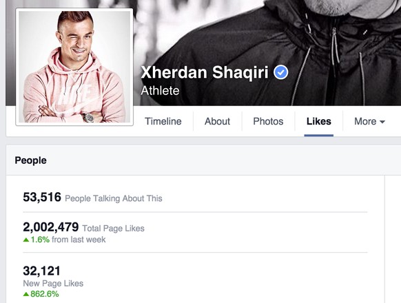 — F.C. Internazionale (@Inter) 9. Januar 2015Shaqiri macht auch neben dem Trainingsplatz eine gute Figur: Der Wechsel von zu Inter Mailand beschert dem Schweizer Nationalspieler einen neuen Rekord: er knackt die 2-Millionen-Grenze an Facebook-Likes. Alleine in der aktuellen Woche «likten» über 30'000 Fans den Schweizer Nationalspieler – es dürfte sich um Tifosi von Inter Mailand handeln.