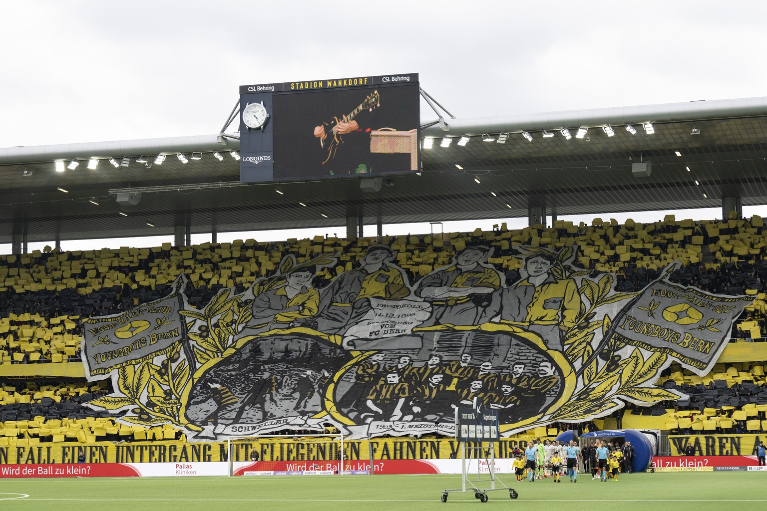 Die Jubiläumschoreo ist dann beim Einlaufen der beiden Teams trotzdem eindrucksvoll zu sehen. Allerdings nicht ganz komplett. Die fehlenden Fahnen präsentieren die FCB-Fans zu Beginn der YB-Viertelstunde in ihrem eigenen Sektor. Rund 50 schwarze und gelbe Fahnen werden plötzlich im Gästebereich geschwenkt, ehe YB sich dann immerhin sportlich revanchiert und dem FCB in der Schlussviertelstunde noch drei Tore zum 3:0-Sieg einschenkt.