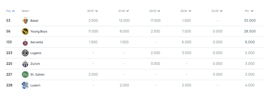 Bevor überhaupt ein Europacup-Spiel gespielt wurde, ist die Schweiz abgerutscht. Der Fall von Rang 12 auf Rang 17 der Fünfjahreswertung fusst auf dem Löschen der Saison 2019/20, welche aus der Wertung fällt und den Punkten für die aktuelle Saison, in der die Schweiz noch ohne Zähler ist.