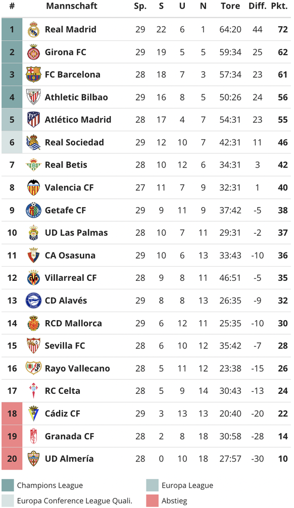 Real Madrid nähert sich dem 36. Meistertitel mit grossen Schritten an. Die Madrilenen siegten in der 29. Runde bei Osasuna nach einer dominanten Vorstellung mit 4:2 und bauten ihren Vorsprung auf Girona auf zehn Punkte aus. Reals Vinicius Junior war Doppeltorschütze, Federico Valverde bereitete drei Treffer vor.