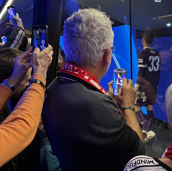 Das stellt sich dann in der Realität so heraus, wie man sich das vorstellt: Fussballer werden gewissermassen zu Zoo-Tieren. Erwachsene, vermögende Männer (und einige Frauen) kleben an den Scheiben, um mit dem Smartphone exklusive Bilder der Kicker zu schiessen. Für die meisten im Raum ist das ein sehr aufregendes Erlebnis.