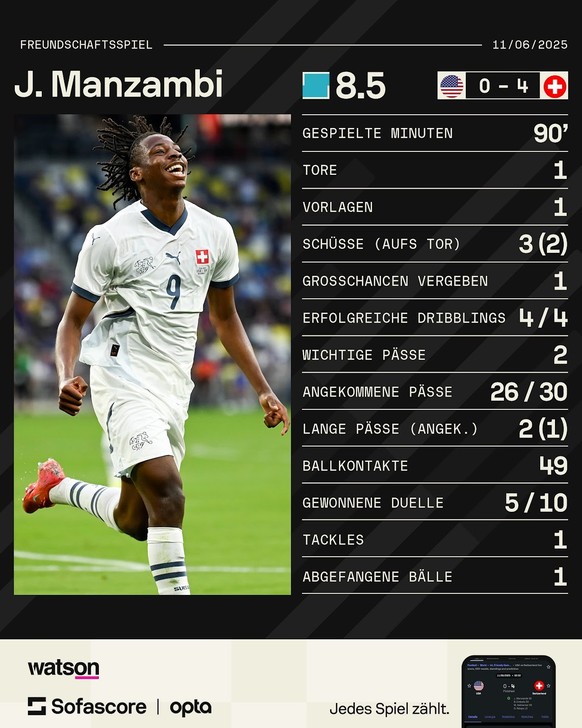 Nach seiner Startelf-Premiere für das Team von Trainer Murat Yakin zeigte sich Manzambi etwas verwundert: «Ehrlich gesagt habe ich nicht erwartet, dass mein erstes Spiel gleich so läuft.» Nach dieser Leistung könne er sicher gut schlafen, fügte er an. «Ich bin sehr glücklich, dass ich in diesem Trikot spielen kann. Ich habe keine Worte, um das zu beschreiben.»