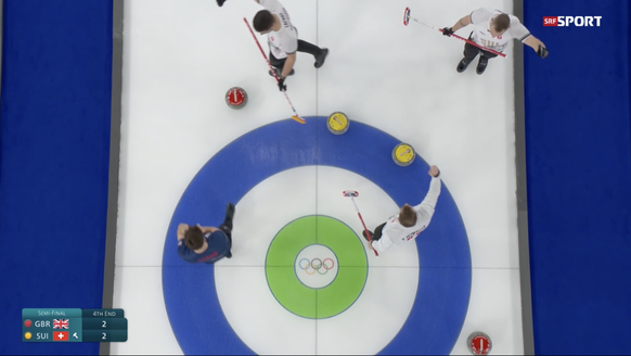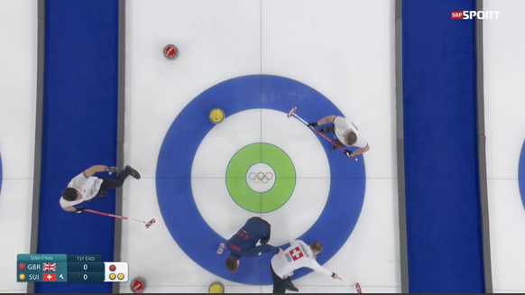 Der erste Stein von Grant Hardie in diesem End misslingt. Er bleibt an der Schweizer Guard hängen, so bietet sich der Schweiz die Chance zum Doppel-Takeout. Das gelingt nicht ganz, einer der beiden britischen Steine bleibt am Rand des Hauses hängen.