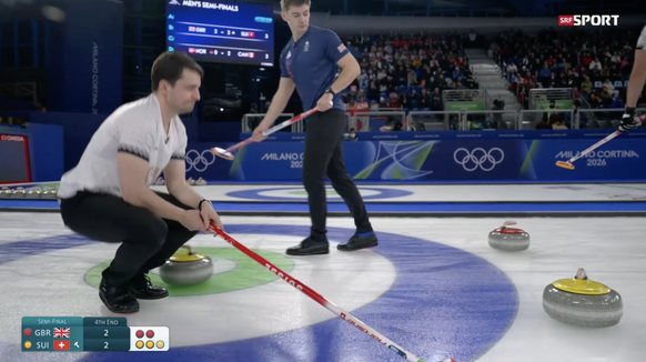 Huch! Grant Hardy und Yannick Schwaller kommen sich beim Wischen im Haus in die Quere. Schwaller stürzt und berührt den roten Stein der Briten. Da dieser aber wohl sowieso aus dem Haus gegangen wäre, akzeptieren die Briten, dass der Stein weg ist.