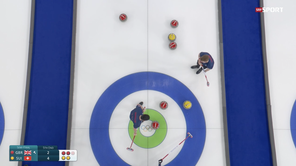 Der letzte Stein von Bruce Mouat in diesem 5. End misslingt. Er bliebt am eigenen Stein im Haus hängen, es gelingt ihm nicht, den Schweizer Stein nach Wunsch herauszuspielen. Zu seinem Glück bleibt der gespielte Stein gerade noch kurz genug, um einen gestohlenen Schweizer Punkt zu verhindern. Aber Grossbritannien schriebt nur einen Stein, die Schweiz bleibt in Führung.