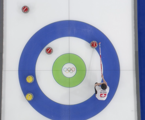 Benoît Schwarz-van Berkel mit einer schwierigen Aufgabe mit dem letzten Stein. Er muss die eigene Guard ins Haus stupsen und dabei auch mit dem selbst gespielten Stein im Haus landen. Das gelingt perfekt, die Schweiz schreibt ein Zweierhaus und legt wieder vor.