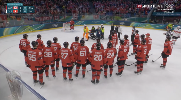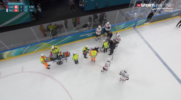 Das Publikum erhebt sich und skandiert Fialas Namen, während der Schweizer auf die Trage verladen wird. Was für ein bitterer Moment. Auch die Kanadier sind allesamt auf dem Eis und klopfen mit den Stöcken aufs Eis, während Fiala abtransportiert wird.