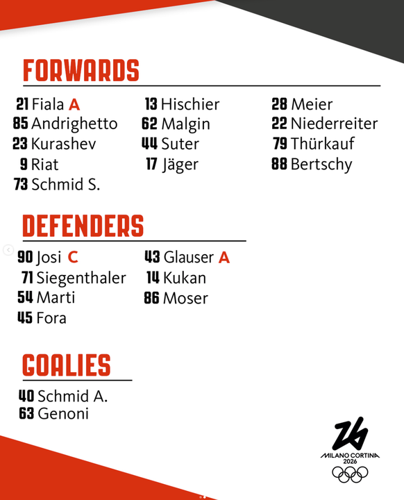 Goalie Akira Schmid feiert heute sein Olympiadebüt, Leonardo Genoni erhält nach dem Auftaktsieg gegen eine Pause. Ansonsten setzt Patrick Fischer auf die gleichen Leute wie beim 4:0 gegen Frankreich, einzig dass Timo Meier in die erste Linie Rückt und Calvin Thürkauf in Linie 3 zum Einsatz kommt.