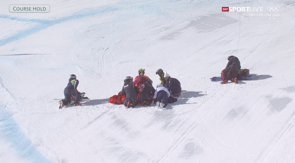 Lindsey Vonn ist mit dem Helikopter auf dem Weg in den Spital. Die Renndirektion lässt einen Vorfahrer über die Strecke, ehe es dann mit der Fahrt der Österreicherin Mirjam Puchner weitergeht.