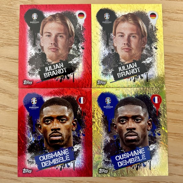 Im Sammelheft zur EM 2024 gibt es einige namhafte Absenzen. So gibt es etwa von Frankreichs Starstürmer Kylian Mbappé keinen Sticker. Auch die Deutschen Manuel Neuer, Toni Kroos und Florian Wirtz fehlen. Der Grund: Hersteller Topps konnte sich die Bildrechte dieser Spielern nicht sichern. Damit es beim deutschen Team trotz dieser Absenzen genügend Bildchen einzukleben gibt, wurden kurzerhand noch drei Legenden auf die Teamseite genommen. Es sind dies Oliver Kahn, Bastian Schweinsteiger und Lothar Matthäus.