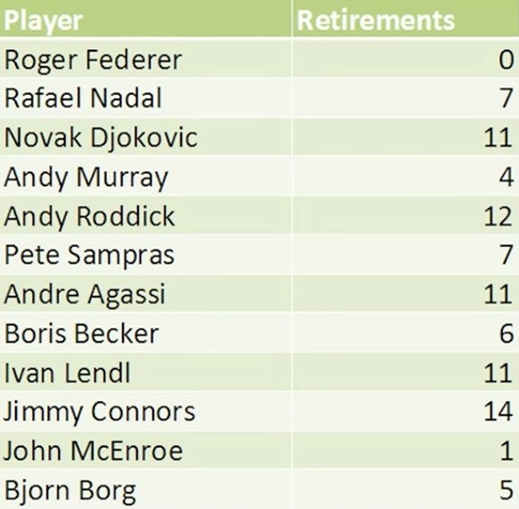 Konditionstrainer Pierre Paganini und seiner effizienten Spielweise sei Dank: Roger Federer ist der fitteste Spieler auf der Tour. Selten sieht man ihn nach längeren Ballwechseln kräftig durchatmen. Noch nie musste er während eines Matchs aufgeben.