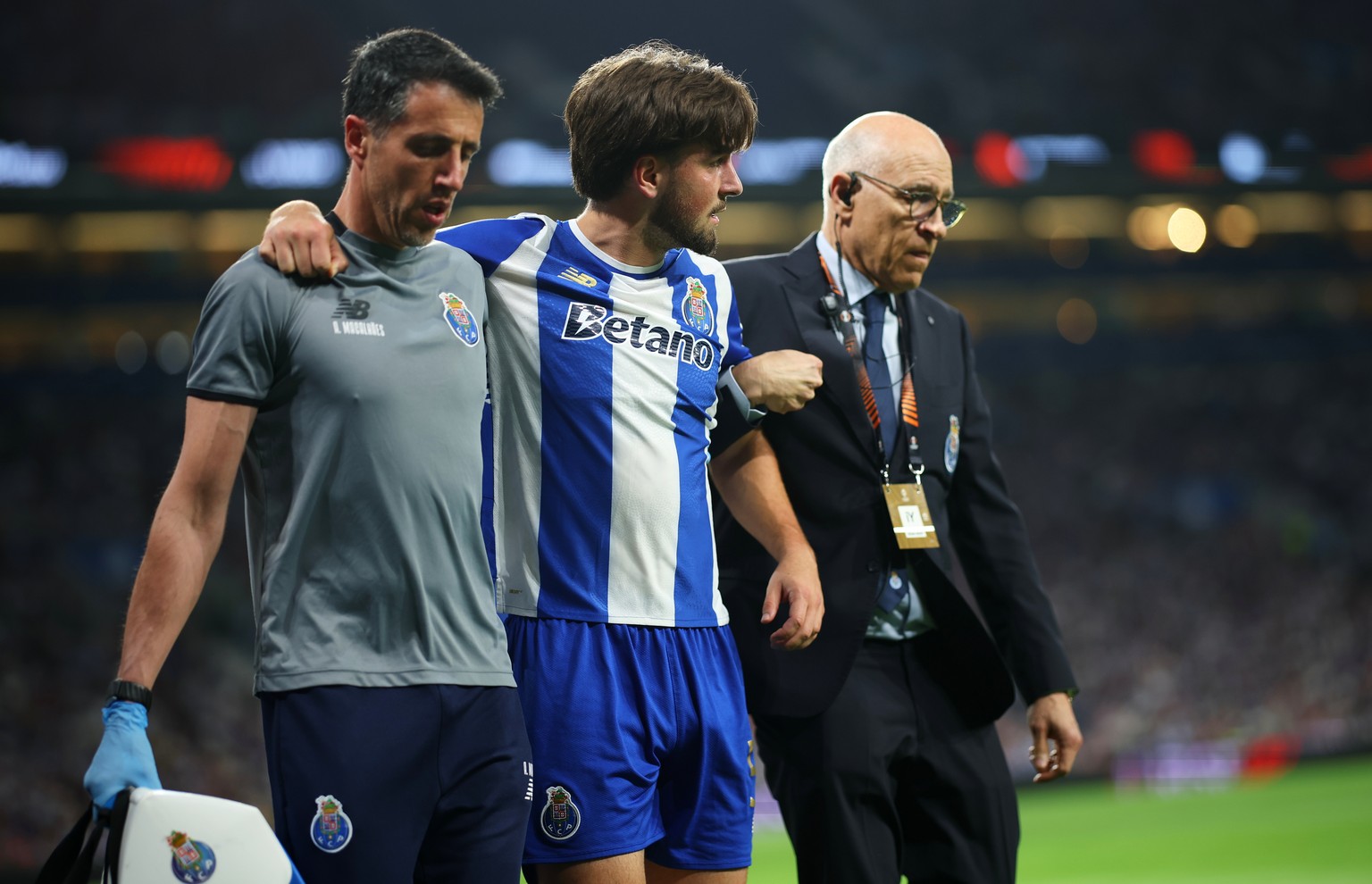 Porto's Martim Fernandes leaves the pitch after getting injured during the Europa League quarterfinals, first leg, soccer match between FC Porto and Nottingham Forest in Porto, Portugal, Thursday ...