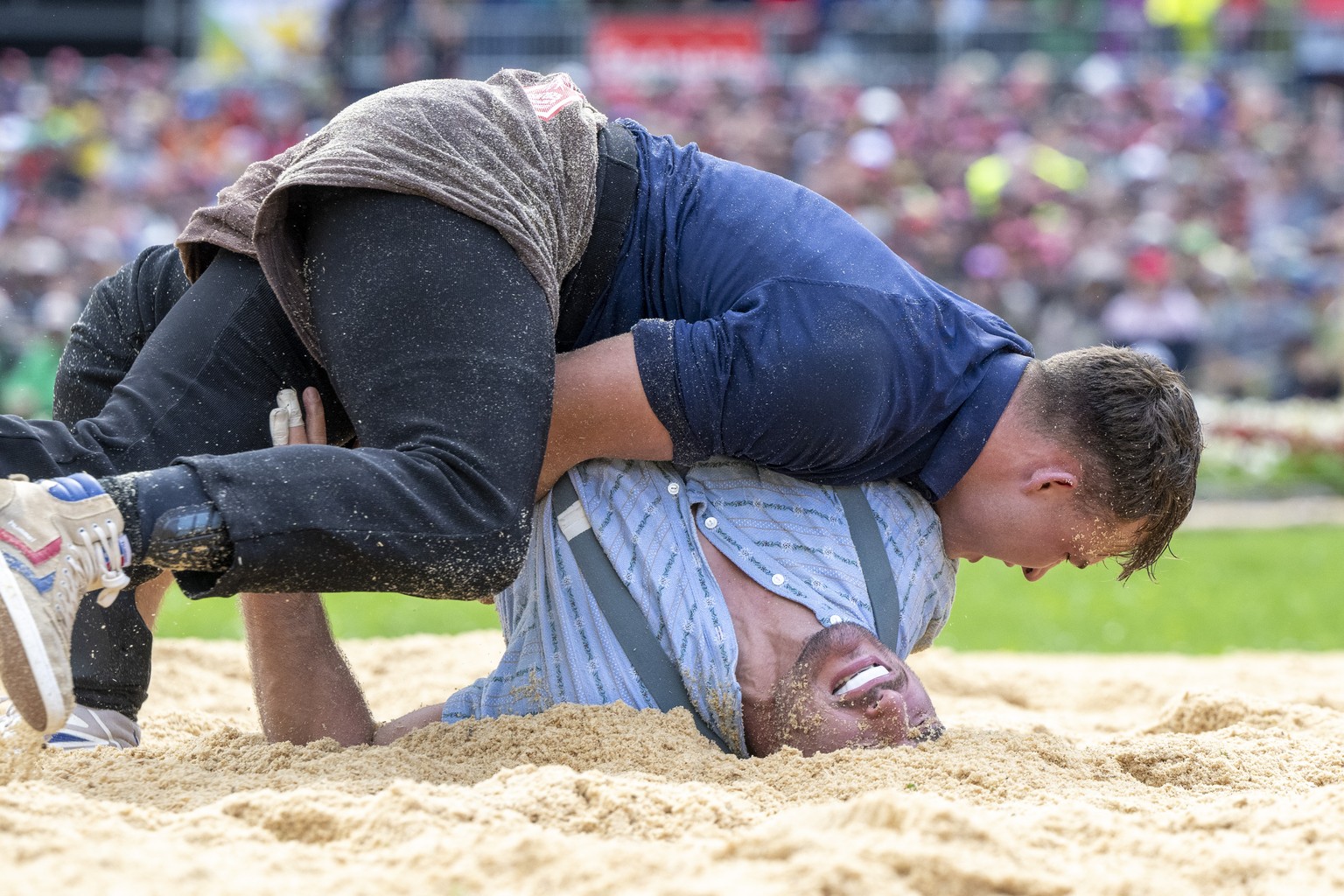 Aus den zwei vermeintlichen Fehlentscheiden der Kampfrichter innert kürzester Zeit gegen die Berner liesse sich eine wunderbare Verschwörungstheorie drechseln: Die «Sägemehl-Mafia» unternimmt alles, um die Berner zu bremsen. Und ist denn nicht der Jüngling Michael Moser (19), noch nicht einmal ein «Eidgenosse» (noch kein Kranzgewinn beim Eidgenössischen) mit König Joel Wicki im 1. und Samuel Giger im 4. Gang zu hart eingeteilt worden?