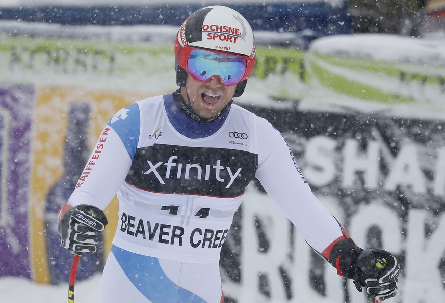 Switzerland's Mauro Caviezel reacts after finishing a Men's World Cup super-G skiing race Saturday, Dec. 1, 2018, in Beaver Creek, Colo. (AP Photo/John Locher)