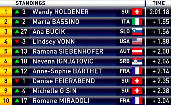 Die Italienerin gilt als Riesenslalom-Spezialistin, aber heute zeigt sie auch im Slalom eine extrem couragierte Leistung – die gekrönt wird mit Rang 1. Exakt eine einzige Hundertstel beträgt Bassinos Vorsprung.