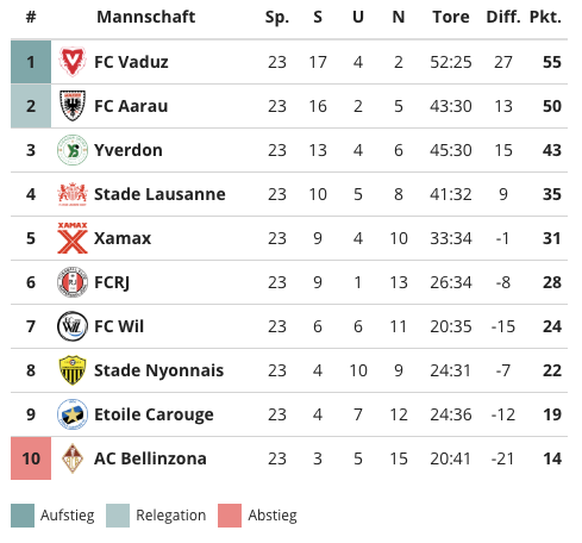 Das drittplatzierte Yverdon konnte vom Fehltritt des FCA nicht profitieren. Bei Etoile Carouge sprang für das Team von Trainer Adrian Ursea nur ein 2:2 heraus. Der in dieser Saison lange verletzt gewesene Varol Tasar glich in der 70. Minute zum 2:2 aus, nachdem Kevin Bua drei Minuten zuvor Etoile Carouge ein erstes Mal in Führung geschossen hatte. (riz/sda)