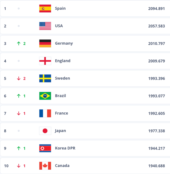 Ganz vorne im Ranking hat sich keine Änderung ergeben. Weltmeister Spanien führt das Klassement weiterhin vor den USA an. Deutschland hat die zuletzt eingebüssten zwei Ränge wieder gutgemacht und nimmt Platz 3 vor Europameister England ein. (nih/sda)
