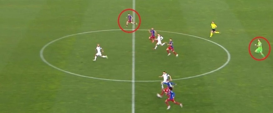 Kurz vor Schluss, beim Stand vom 2:3 aus Sicht des Heimteams, kommt der FCZ zu einem Eckball. Die Basler klären den Ball und leiten den Konter auf das verlassene Zürcher Gehäuse ein – denn der Zürcher Torwart Yannick Brecher war im Basler Strafraum vorne mit dabei.