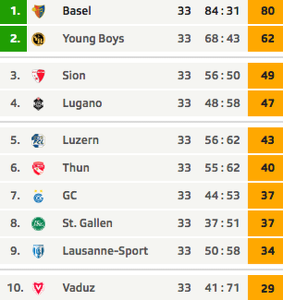 – Sion muss sich weiter um die EL-Qualifikation sorgen. Die Walliser liegen jetzt zwei Punkte vor Lugano und deren sechs vor Luzern.