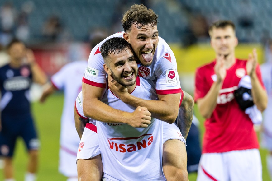 Genis Montolio (FCT), unten, und Valmir Matoshi (FCT) jubeln ueber den Sieg im Fussball Meisterschaftsspiel der Swiss Super League zwischen dem FC Luzern, FCL, und dem FC Thun, FCT, am Samstag, 9. Aug ...