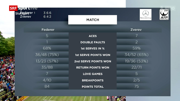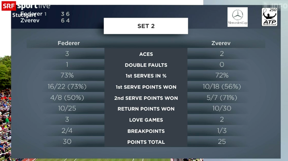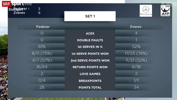 Nach den beiden Breaks bringt Zverev dieses Spiel durch. Federer beendet es mit einer Rückhand ins Netz. Genau eine Stunde ist vorbei.