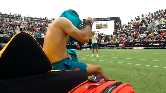 Zwar war er kurz in den Katakomben – aber sein Shirt wechselt Roger Federer erst am Court wieder.