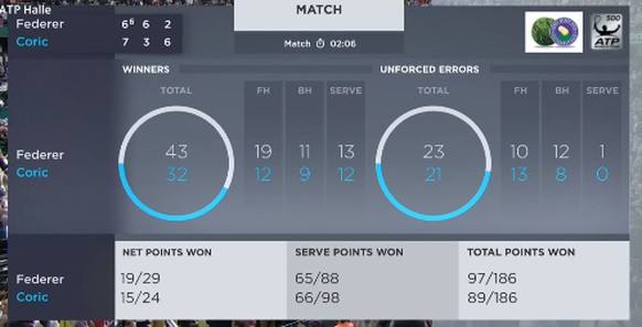 Die Niederlage war nicht zwingend, aber sie traf trotzdem ein. Federer hätte genügend Möglichkeiten gehabt, die Partie in andere Bahnen zu lenken, zumal er insgesamt acht Punkte mehr gewann als der Kroate. Doch der 21. Sieg in Serie auf Rasen wollte nicht gelingen. Als der 36-Jährige im dritten Satz beim Aufschlag kurz nachliess, verwertete Coric prompt seinen ersten Breakball und feierte wenig später seinen bislang grössten Erfolg.