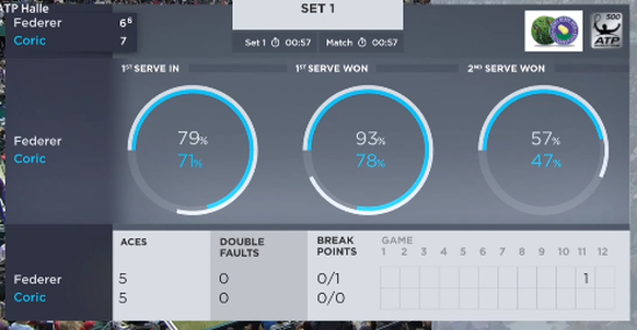 Mit einem weiteren Ass sichert sich Federer sein drittes Game. Immerhin gelang Coric sein erster Punkt bei Aufschlag Federer.
