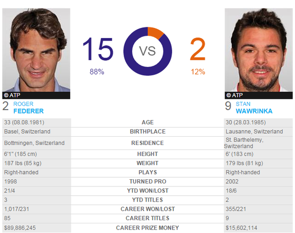 Auch wenn das Head-to-Head auf den ersten Blick eine klare Angelegenheit für Federer verheisst, so hat Wawrinka insbesondere in den letzten Partien bewiesen, dass er den Maestro mehr als nur fordern kann. Ausserdem erzielte der Romand beide seiner Erfolge gegen Federer auf Sand – 2009 und 2014 in Monte Carlo. Auch heute können wir uns wieder auf eine hoffentlich ausgeglichene Partie freuen, in den letzten fünf Partien konnte Stan nämlich immer mindestens einen Satz gewinnen.
