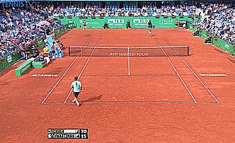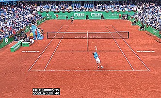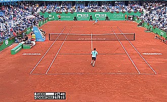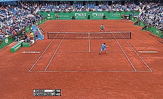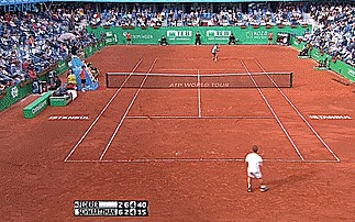 Der Ball von Federer landet hinter der Grundlinie. Schade, Federer war voll drin in diesem Ballwechsel.