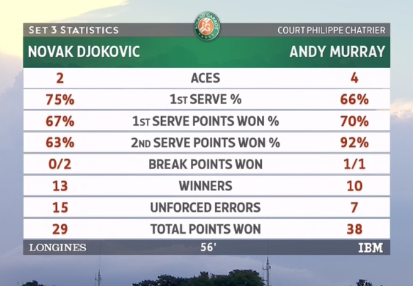 — Roland Garros (@rolandgarros) 5. Juni 20156:3 6:3 5:7 3:3 - Game - Andy Murray