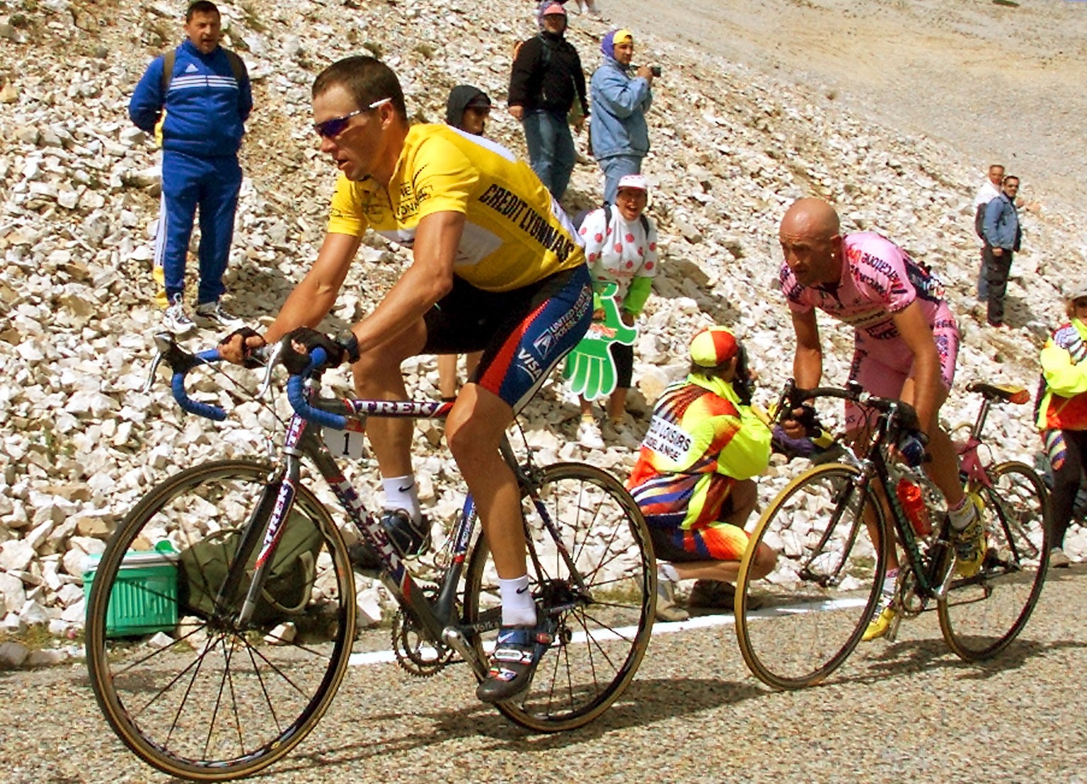 Pantani und Armstrong auf dem Mont Ventoux. Bild: AFP