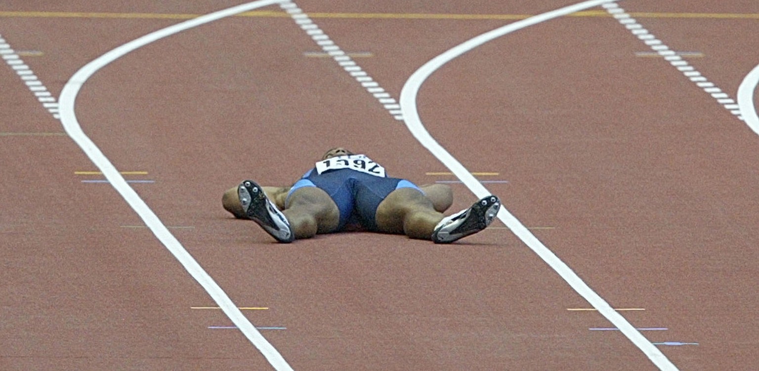 Nach seinem Ausschluss tigert der Sprinter wie wild umher und schliesslich legt er sich vor seinem Startblock provokativ auf den Boden. Die TV-Kameras und Fotografen sind natürlich hautnah dran.