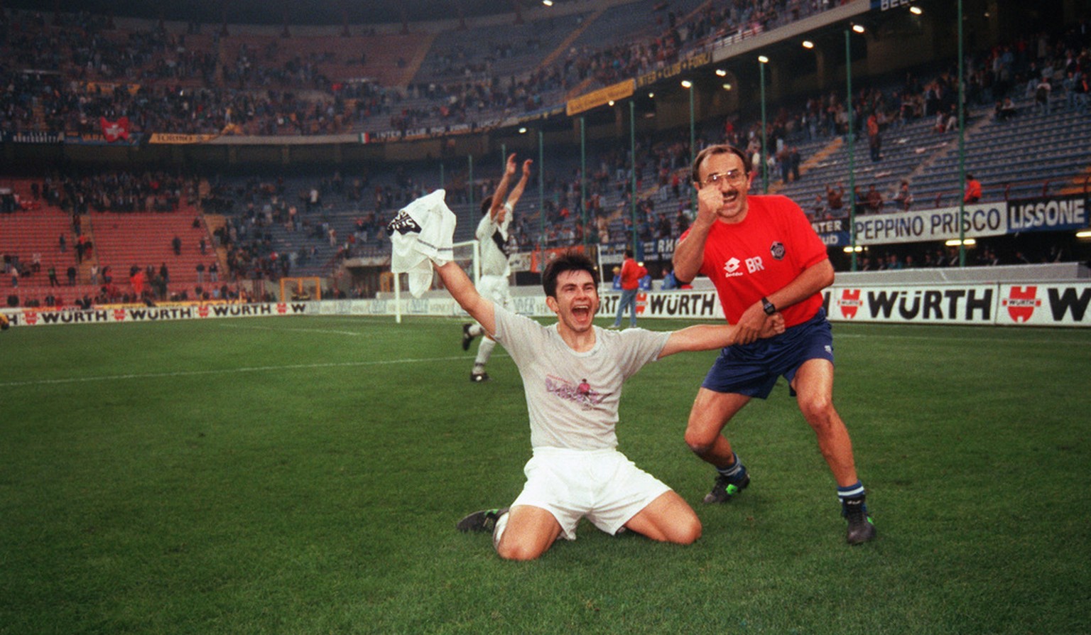 Carrasco versucht es wieder. Er zirkelt den Freistoss vorbei an der Mauer auf die nahe Ecke. Und es klappt, der Ball fliegt an Freund und Feind vorbei. Pagliuca sieht ganz schlecht aus: Zwischen seinem Körper und dem Pfosten findet das Leder den weg ins Tor. Wenig später ist Schluss im San Siro und die Sensation perfekt.