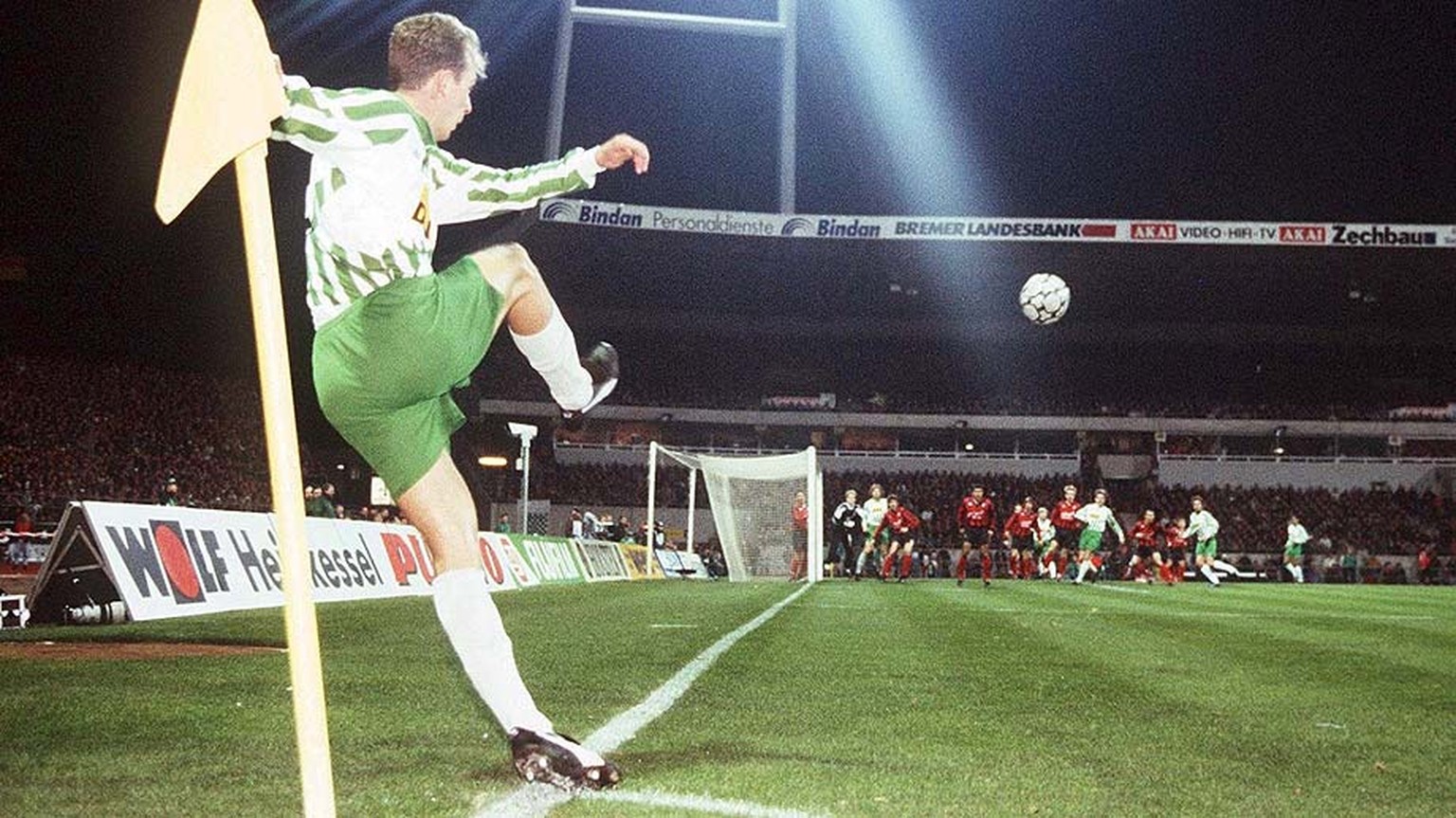 In der 39. Minute kommt der Favorit zu einer Ecke. Standards sind bei Bremen für gewöhnlich eine Angelegenheit für Spezialist Mario Basler.