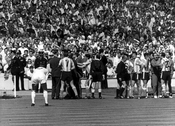 Der Deutsche Schiedsrichter Rudolf Kreitlein trägt Luis Artime in sein Verwarnungsbüchlein ein, Gelbe Karten gibt es ja noch nicht. Captain Antonio Rattin will gegen den daraus resultierenden Freistoss protestieren. Der Mittelfeldspieler sagt dem Schiedsrichter, er möge einen Dolmetscher kommen lassen. Kreitlein versteht kein Spanisch, Rattin kein Deutsch. Kreitlein besteht darauf, dass das Spiel fortgesetzt wird, Rattin will einen Dolmetscher.