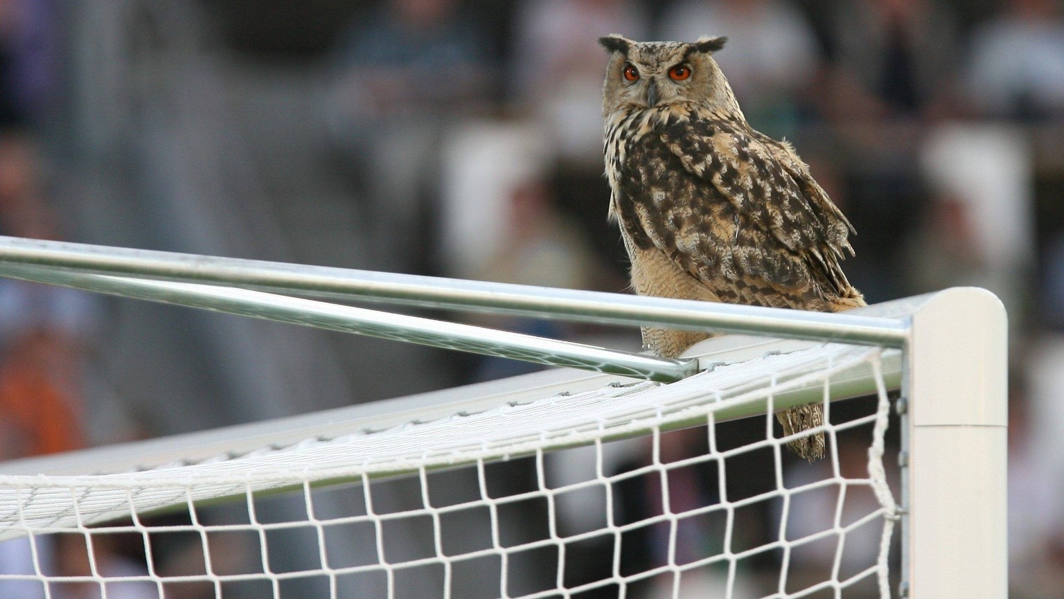 Das Publikum johlt und klatscht. So angestachelt, denkt der majestätische Uhu nicht daran, die Bühne zu verlassen: Er segelt quer über den gesamten Platz, um das Erlebnis auch von der anderen Querlatte aus zu haben. Blöd nur, dass ihm die Vogelperspektive nichts nutzt: Denn Fussball wird nicht gespielt, solange er da oben hockt.