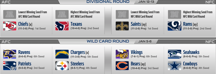 Die folgenden zwölf Teams wären beim jetzigen Stand in den Playoffs. Noch zwei Spieltage stehen auf dem Programm, die Kansas City Chiefs, die New Orleans Saints, Los Angeles Rams, die Los Angeles Chargers und die Chicago Bears haben das Playoff-Ticket auf sicher.