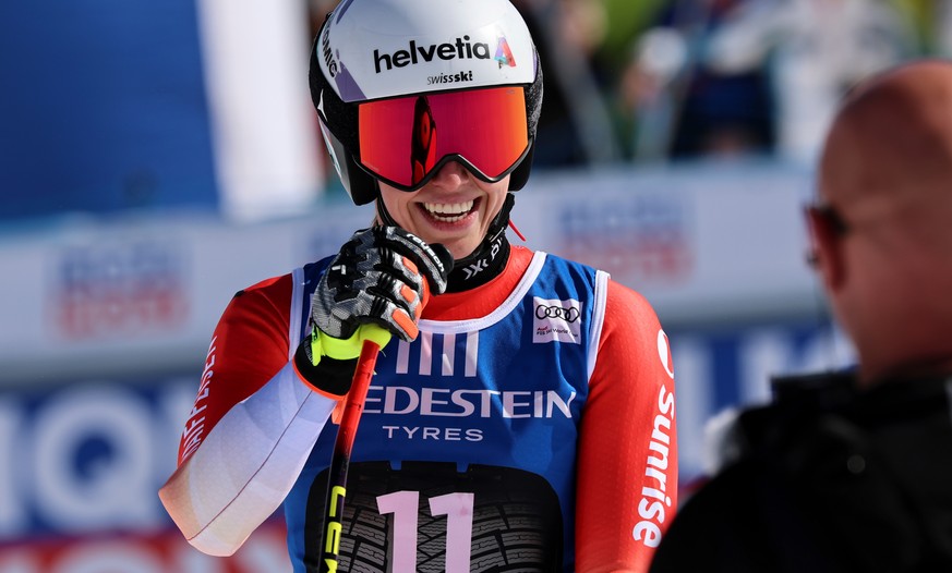 Switzerland's Malorie Blanc at the finish area of an alpine ski, women's World Cup super-G, in Val di Fassa, Italy, Sunday, March 8, 2026. (AP Photo/Marco Trovati)