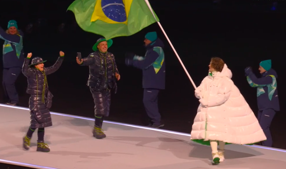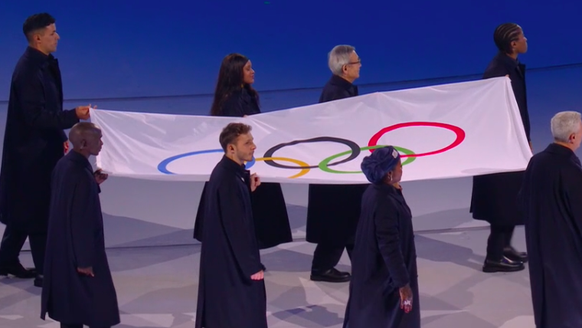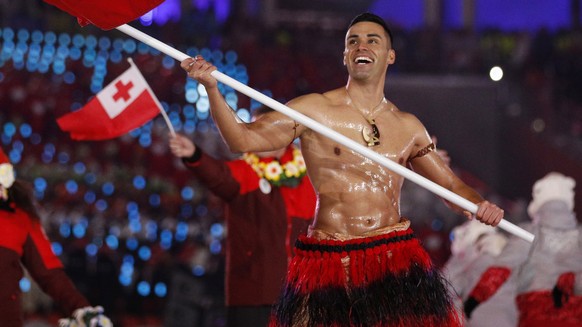 Oh, ein schönes Wiedersehen! Pita Taufatofua ist einer der Träger der olympischen Flagge. Heute trägt der Ex-Athlet aus Tonga einen Anzug, anders als er 2018 als Langläufer selber an Winterspielen teilnahm und an der Eröffnungsfeier mit seinem Outfit für Furore sorgte.